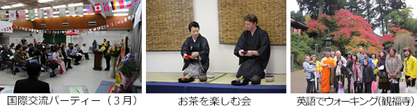 行事を通して、会員同士の交流、国籍を超えた参加者同士の交流の場を提供します。現在、「お茶を楽しむ会」と「英語でウォーキング」を行っています。